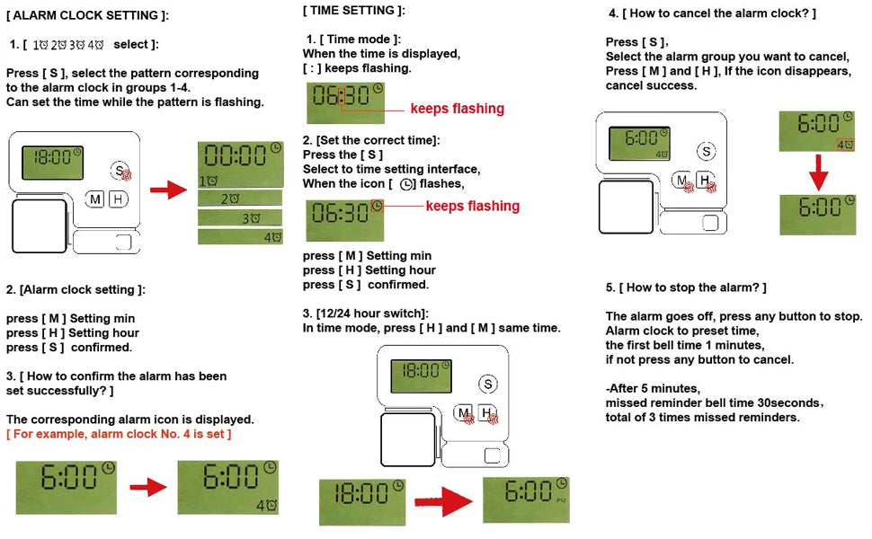 ★Setp3: Press the "H" button to set the hour, press the "M" button to set the minute, and press the "S" button to confirm the set time. The corresponding alarm is set successfully.
