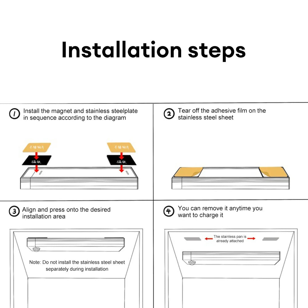 3: Rechargeable: it can be used for a long time on a single charge. The fixing method is magnetic. Peel off the adhesive on the back of the magnet in the package and stick it to the wall or cabinet. The induction light can be attached to the magnet.