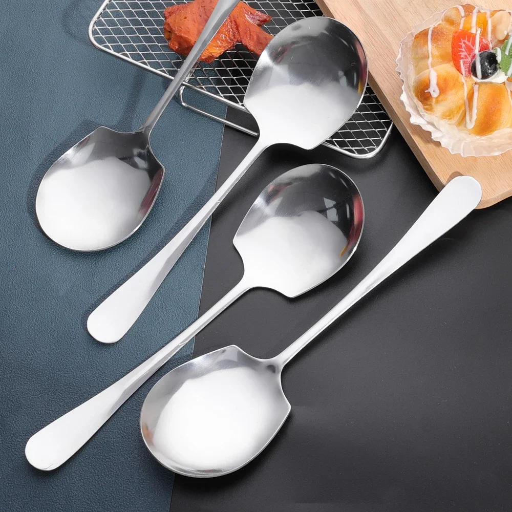 Stainless Steel Large Spoon Long Handle Soup Public Spoons Big Head Round Fruit Food Scoop Kitchen Restaurant Tableware Ladle